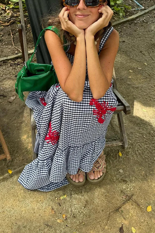 Maysa - Langes kariertes Kleid mit gestickten Shrimps