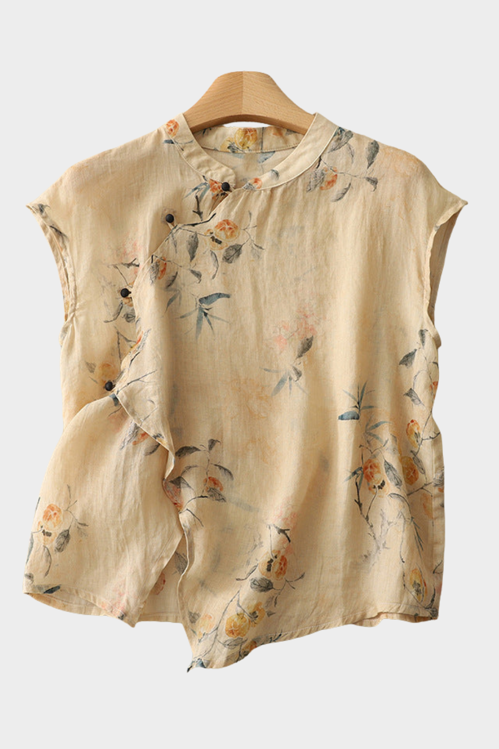 Diese ärmellose Bluse aus Leinen tanzt mit winzigen Blumen auf einem anthrazitfarbenen Stoff. Der weiche Mandarinkragen und die schräge Knopfleiste sind eine Anspielung auf die Tradition - leicht und luftig, genäht für ruhige Vormittage und langsame Nachmittage.