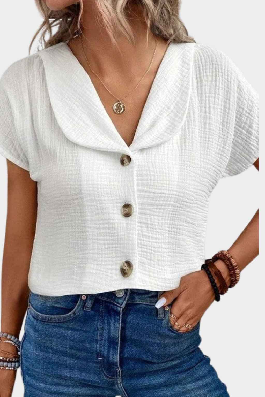 La camicetta Caterina è l'ideale per un look estivo chic. Realizzata con un tessuto leggero e traspirante, questa camicetta offre comfort durante le giornate più calde, senza rinunciare a uno stile sofisticato. Perfetta per una passeggiata in città o un'uscita serale, si abbina facilmente a jeans o gonne per un look raffinato e casual.
