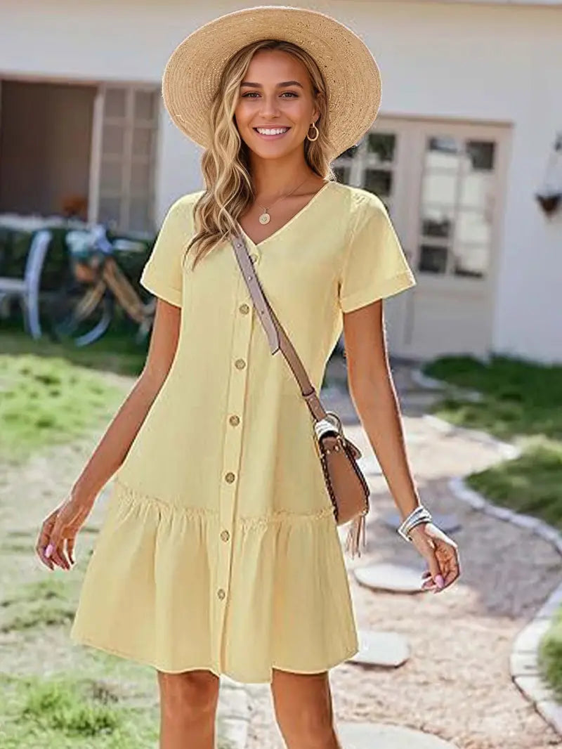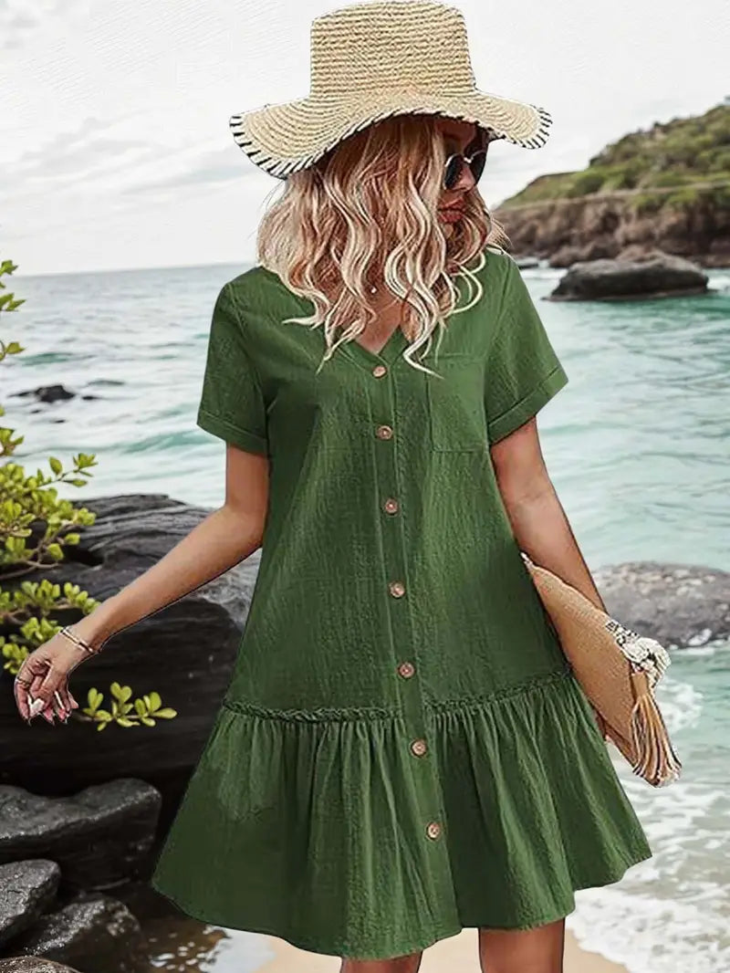 Das Isla Kleid mit Volantsaum und Knopfleiste ist einfach und luftig!