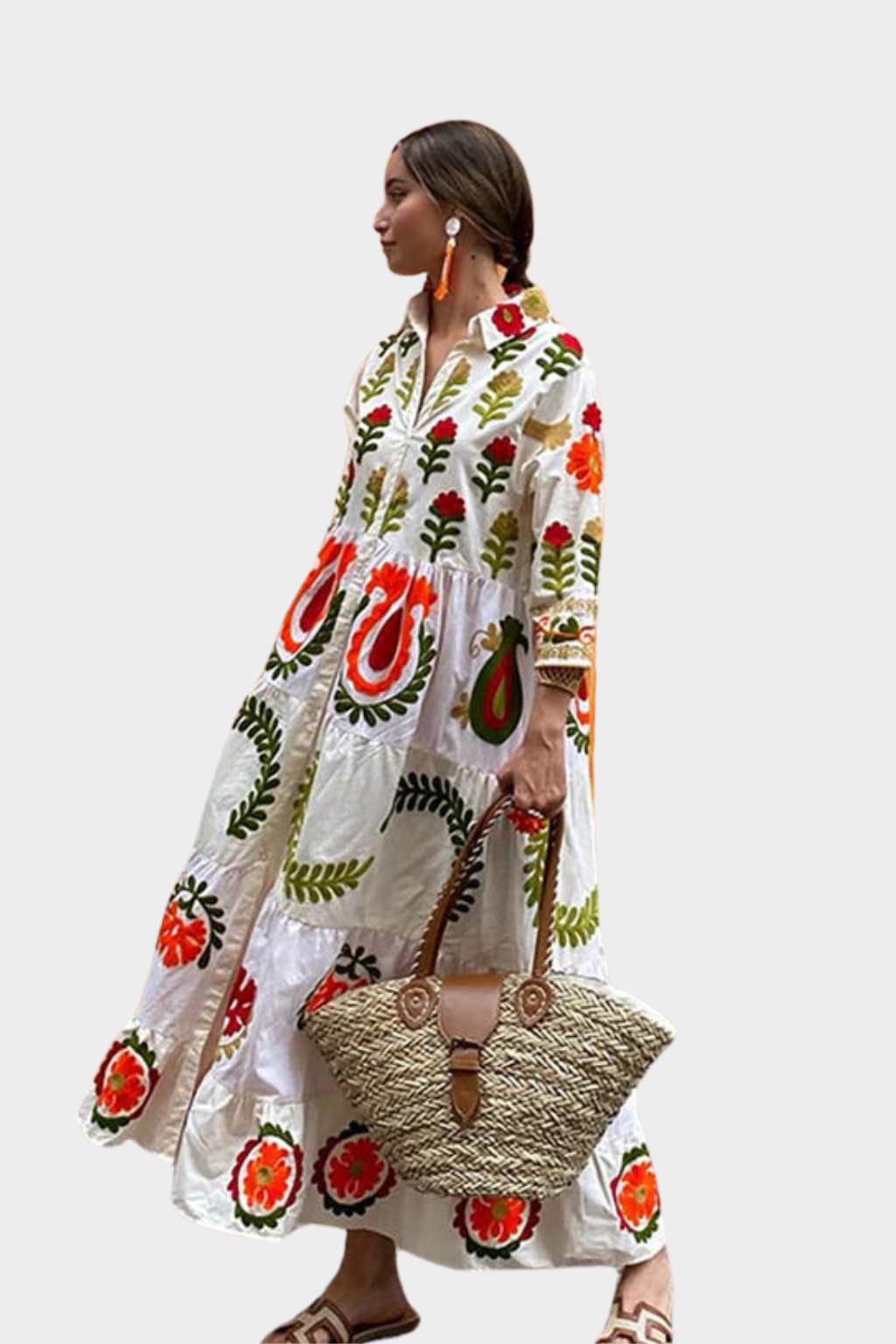 Lassen Sie mich Ihnen das Luisa-Kleid vorstellen, eine wunderbare Mischung aus festlichem Charme und sommerlicher Eleganz. Dieses weite Patchwork-Kleid für Damen besticht durch ein stilvolles Design mit kontrastierenden Farben, ideal für legere und elegante Anlässe.