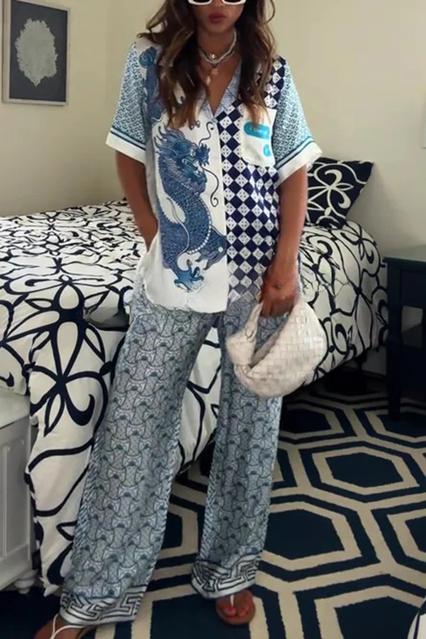 Einzigartige Dragon Print kurze Ärmel lockeres Shirt und elastische Taille Tasche Hosen Set